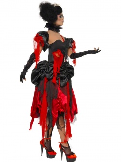 Tento kostým Srdcová královna zahrnuje černo-červené šaty s černými rukavicemi a obojkem kolem krku.