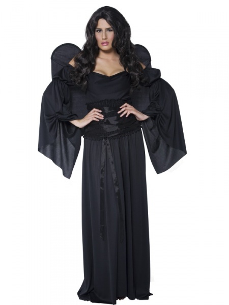 Tento elegantní kostým anděla spadlého z nebes je to pravé pro blížící se karneval! Skládá se z dlouhých černých šatů převázaných stuhou v pase, přídavných rukávů a křídel.