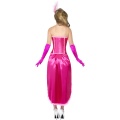 Tento sexy kostým pro kabaretní tanečnice se skládá z luxusní růžové sukně a korzetu s bílým zdobením.