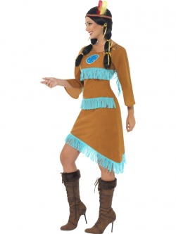 Tento Indiánský kostým zahrnuje šikmo střižené šaty zdobené třásněmi. Hodí se na indiánskou nebo westernovou párty z divokého západu.